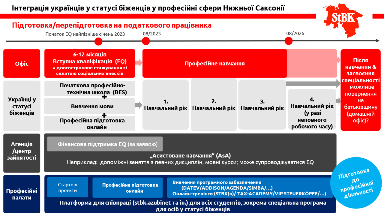 Ми прагнемо всебічної підтримки вас та вашого перебування в Німеччині і тому зібрали на цій сторінці актуальну інформацію, яка ознайомить вас із можливістю отримати професію консультанта з питань оподаткування.