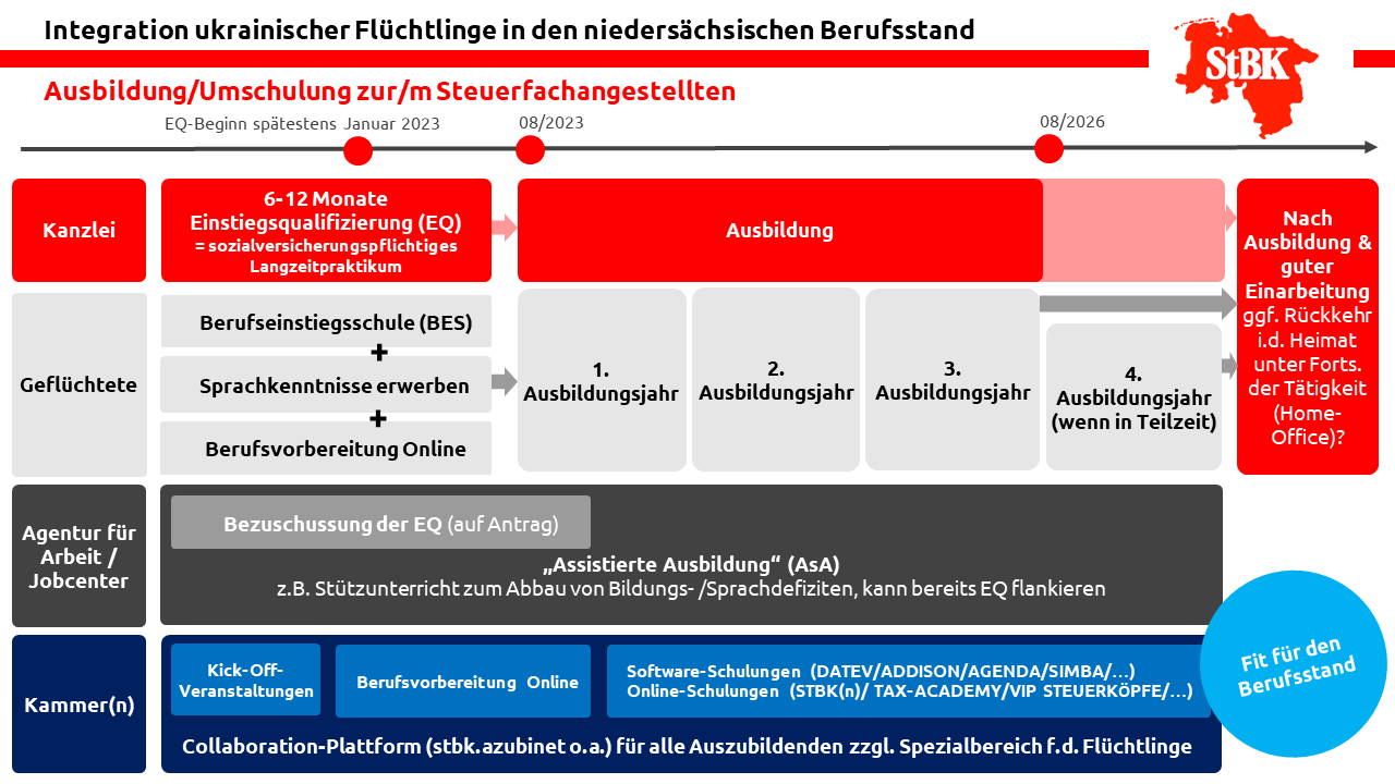 Ziel ist es, Ihnen als Geflüchteten eine umfassende Zusammenstellung an die Hand zu geben, damit Sie sich über einen vielschichtigen, zukunftsweisenden und hoch digitalisierten Ausbildungsberuf informieren können. Sollten wir Ihr Interesse geweckt haben, so können Sie sich über die zahlreichen Förderprogramme der Arbeitsagenturen für die Ausbildung zur/zum Steuerfachangestellten qualifizieren.